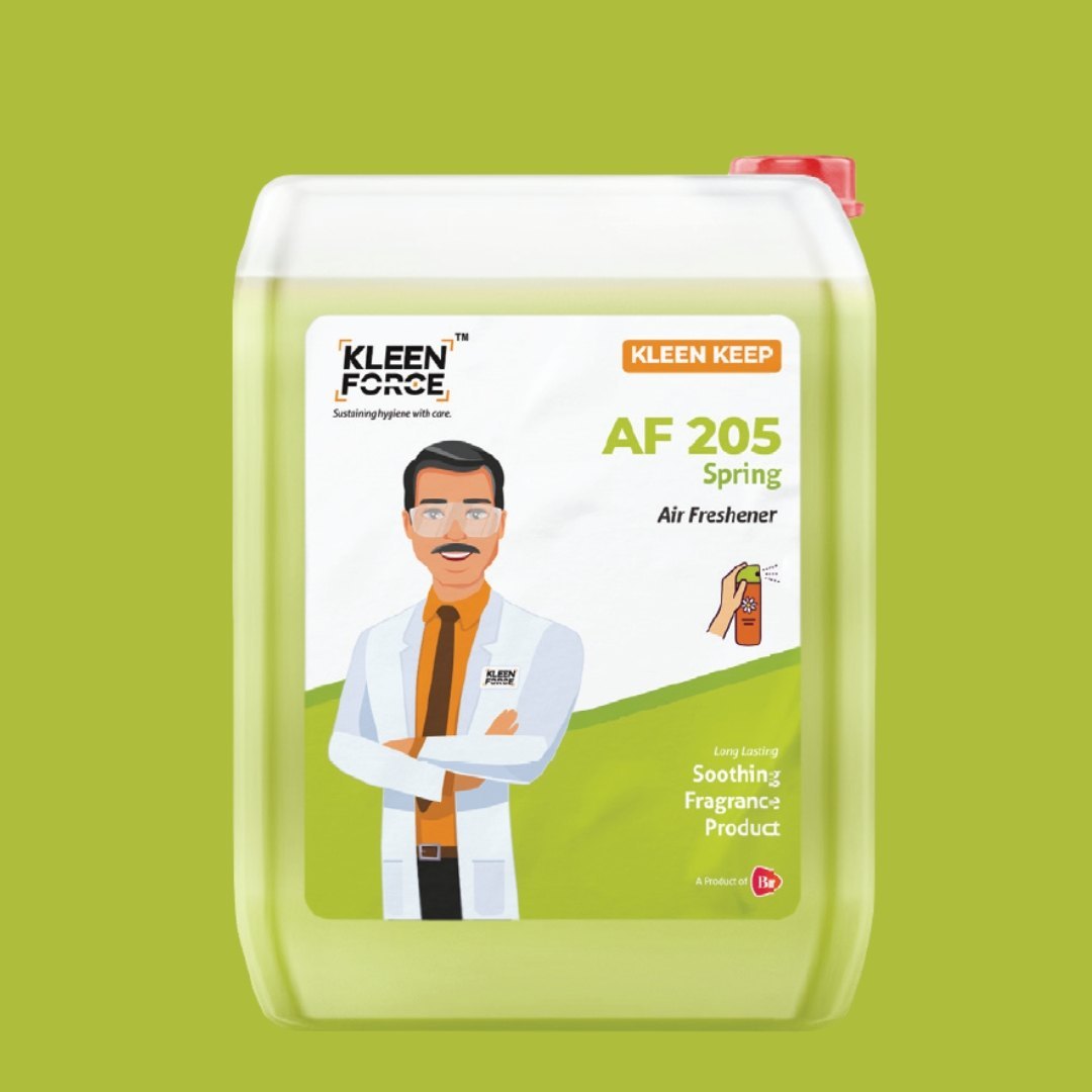 Kleen Keep AF 205 Spring is a ready-to-use, liquid air freshener by Kleen Force with a long-lasting lemongrass fragrance, designed for institutional use in washrooms, guest rooms, and public areas to provide a refreshing and pleasant scent, according to Kleen Force and IndiaMART. It offers a welcoming and fresh feel to spaces, and can be applied by spraying it upwards in the center of the room.