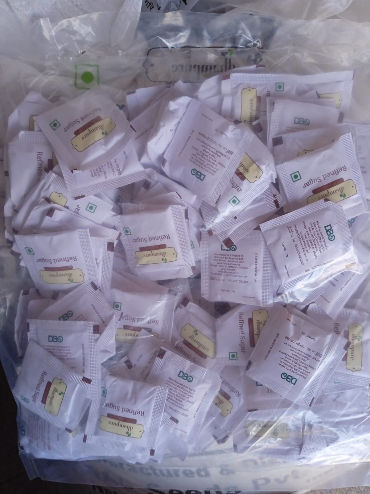 Dhampure White Sugar Sachets contain their branded white crystal sugar, which is a refined, non-acidic sugar that is perfect for sweetening drinks and other dishes on the go, providing immediate sweetness due to its fine crystal structure.