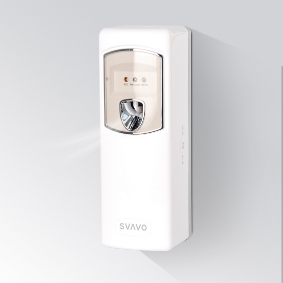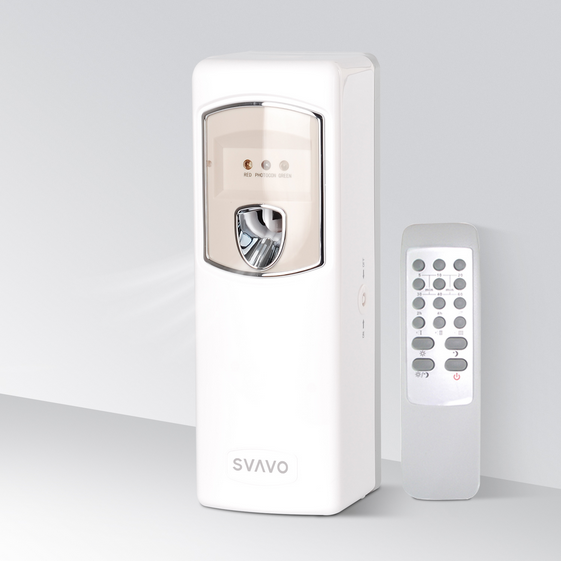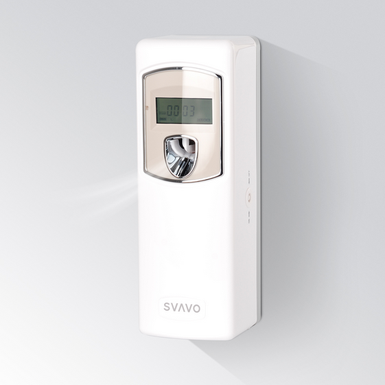 The SVAVO V-880D is a programmable, automatic aerosol perfume dispenser with an LCD display for setting spray intervals, a clock function, and a spray counter. It is powered by two AA batteries and can be either wall-mounted or used freestanding to disperse fragrance at set times. The dispenser is designed to fit most standard aerosol air freshener cans, making it a convenient solution for maintaining fresh-smelling spaces in homes, offices, and public areas.